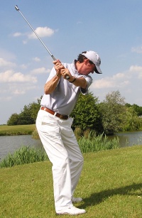 Eén van de meest voorkomende gevolgen van een (te) lange backswing is dat de voorste schouder omhoog komt, waardoor het achterste been strekt. Het omhoog komen van de schouder zorgt ervoor dat u teveel een neerwaartse beweging moet maken en het strekken van de knie zal veelal leiden tot een slag vanuit de armen, doordat het achterste been gewoonweg ‘op slot’ staat. De eenvoudigste manier om dit op te lossen is om er op te letten dat de achterste knie gebogen blijft. Zet hem daarbij niet op slot maar hou hem stabiel. Denk daarbij aan de ‘dynamische balans’. Tijdens de gehele golfswing dient de balans aan de buitenkant van de bovenbenen te zijn; een stabiele houding voor een solide swing. Als u de backswing oefent dan kunt u makkelijk voelen of u goed staat ‘in uw achterste knie’ en dit gevoel herhalen als u de bal daadwerkelijk slaat. Let daarbij dan niet perse op het resultaat want u bent tenslotte iets nieuws aan het oefenen en veranderingen leiden helaas niet direct tot gewenste resultaat. Heb dus geduld.